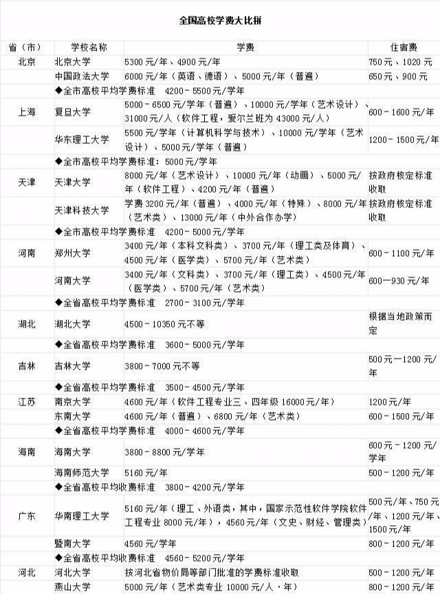 ·普通本科专业,如清华、北大等,大部分高校都在5000-6000元/学年左右。