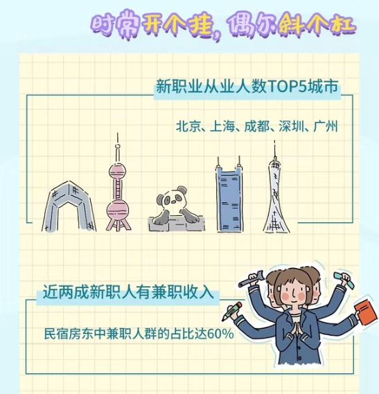 新职业者都有一个重要标签——“斜杠青年”。就是说,接近两成的新职业者有一份或多份兼职工作,收入来源更加多元化。比如,大受年轻人欢迎的民宿房东职业,兼职率高达到六成左右。