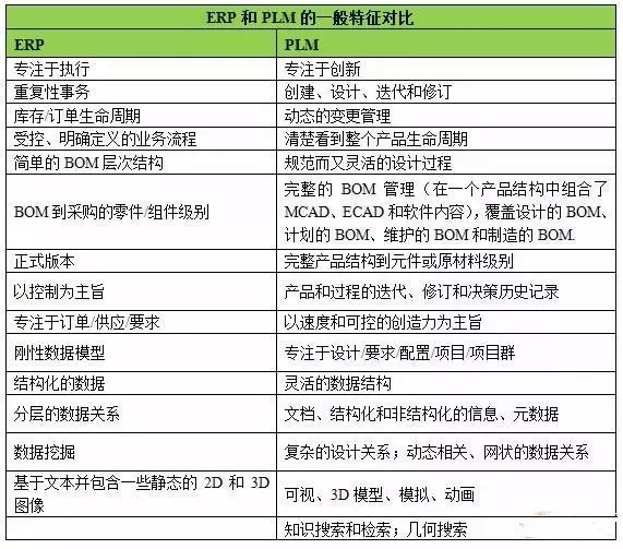 ERP和PLM都能且应该在企业应对和克服这些所面临的挑战的过程中扮演重要角色,下表是ERP和PLM主要特征的对照。