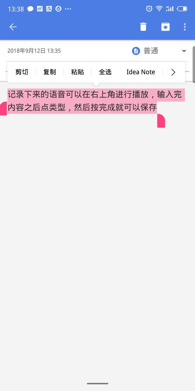 记录之后,可以按照“普通”,“重要”,“任务”,“闪念”四个类型分类,并且可以播放当时的录音。点完成自动记录