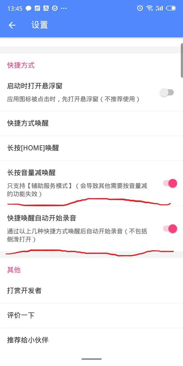 3. 进入APP设置——音量键唤醒,开启快捷键开启自动录音