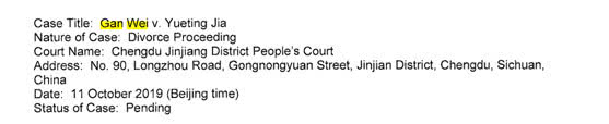 据法律服务企业Epiq Cases网站最新披露的贾跃亭破产文件显示,贾跃亭和其妻子甘薇于今年10月11日在成都市锦江区人民法院申请离婚,该案状态显示为审理中。