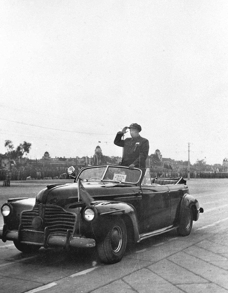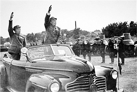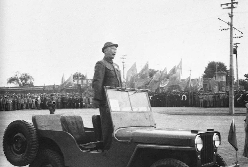 朱德总司令在总指挥聂荣臻的陪同下乘坐敞篷车检阅部队