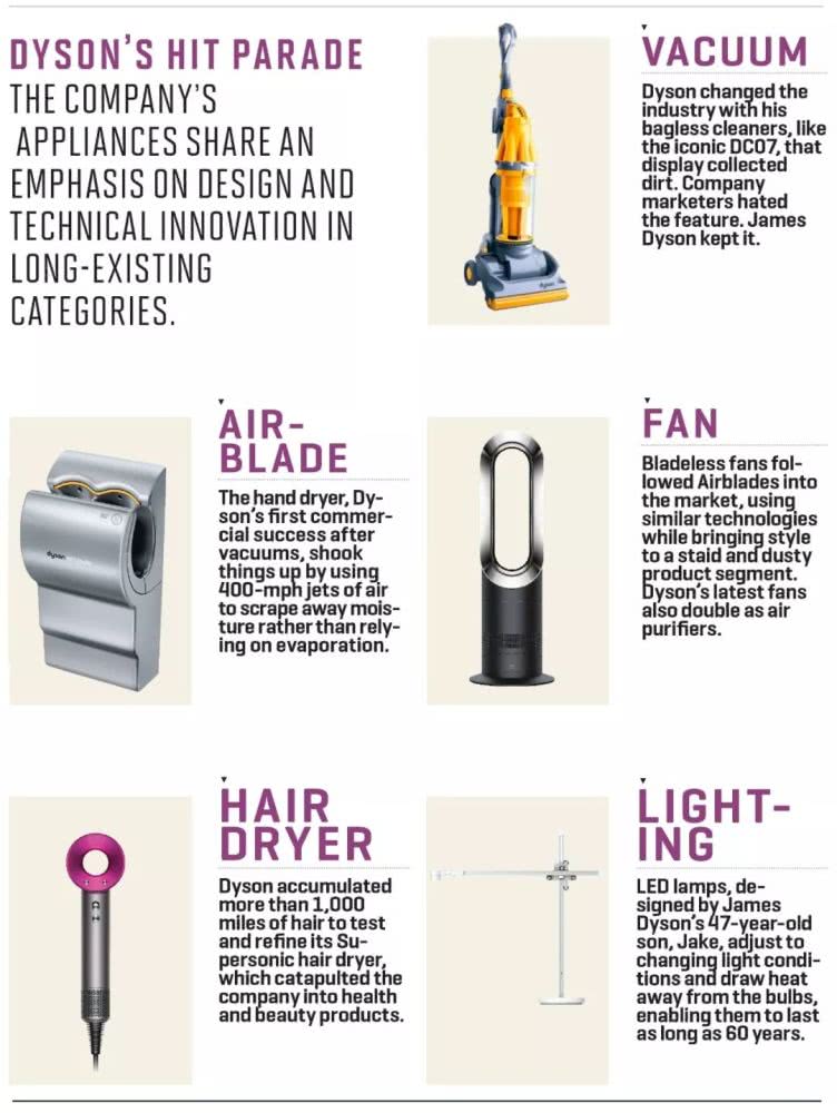 戴森公司产品系列,包括吸尘器、烘手机、无叶风扇、吹风机、LED灯