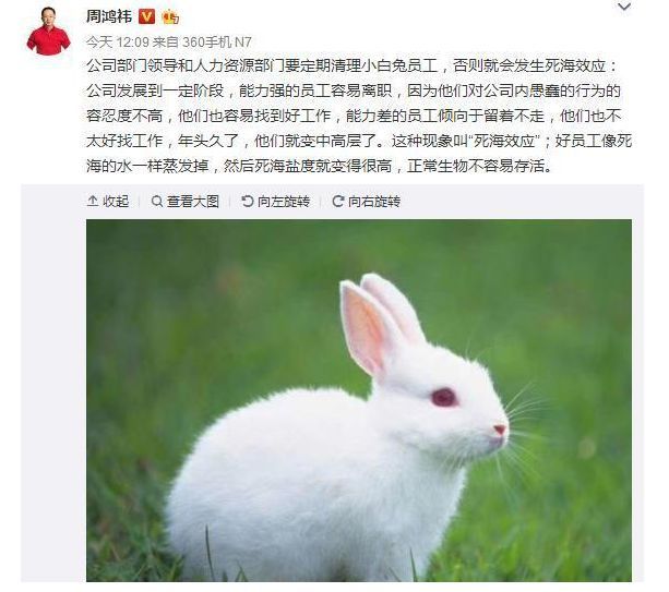 前段时间,360董事长周鸿祎发微博称,要定期清理公司那些小白兔员工。其基本逻辑是,能力差的员工,喜欢倾向于留着不走,年头久了,他们就成了中高层。这些中高层就会逼走那些能力强的员工。
