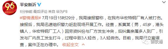 7月19日,一段“华宏特钢厂发生打架斗殴事件”的视频在网络流传,有网友称因几名在厂上班的工人被打,被打工人的家长们前去工厂“讨说法”后却再次被打。7月19日晚,江苏省徐州市新沂市公安局官方微博发布警情通报,称黄某因劳资纠纷与厂方发生冲突,后纠集亲属,与厂内员工发生打斗。打斗致3人轻伤,3人轻微伤。目前,警方已立案调查,案件正在办理中。