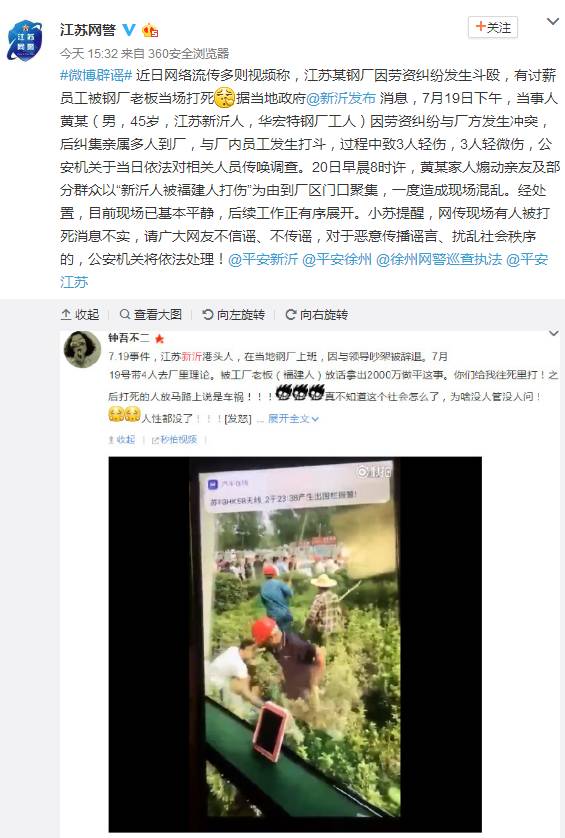 7月19日22时20分,江苏省徐州市新沂市公安局官方微博发布警情通报,称事情起因为厂方一工人黄某因劳资纠纷与厂方发生冲突,并纠结亲属多人到场,引发与厂内员工发生打斗,打斗过程致3人轻伤,3人轻微伤。目前,警方已立案调查,案件正在办理中。