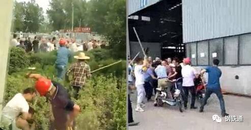 网传视频显示,在一白色车辆旁,许多头戴施工安全盔的工人与部分村民相互对峙并伴有冲突行为。不远处,几名头戴红色安全盔的工人对一男子进行殴打,其中一名工人手持短锤对一男子进行了长达十秒的殴打。在视频另一幕中,许多人聚集在“17”号厂区(仓库)的门前对峙,人群中有人手持长棍并对另一男子进行殴打。