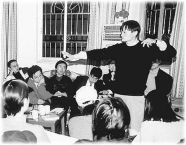 1999年1月15日,马云和他的团队悄然南归。 1999年2月,在杭州湖畔家园马云的家中召开第一次全体会议,18位创业成员或坐或站,神情肃穆地围绕着慷慨激昂的马云,马云快速而疯狂地发表激情洋溢的演讲“黑暗中一起摸索,一起喊,我喊叫着往前冲的时候,你们都不会慌了。你们拿着大刀,一直往前冲,十几个人往前冲,有什么好慌的?”在这次“起事”的会议上,马云和伙伴共筹了50万元本钱。并按照惯例进行了全程录像,马云坚信这将有极大的历史价值。