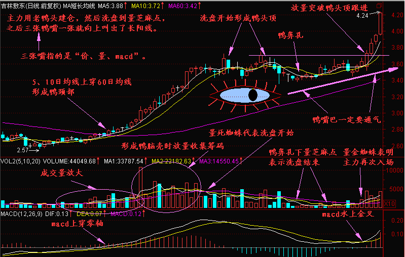 (3)当股价放量冲过鸭头顶瞬间时介入。