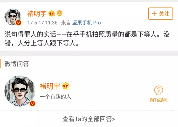 如果说举王思聪的例子,你们觉得太过极端,那么请褚明宇以及他的支持者好好了解一下,现在的电竞从业者,投资者,不乏学霸,海归,自主创业,名校毕业的人才,职业选手也并非“游戏打得好”为唯一评判标准。所以在您的眼里,这些人都是屌丝罢了,而您和您的粉丝,是会自嘲的上等人。