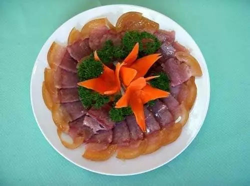 宣威火腿产于云南曲靖宣威市,主要特点是形似琵琶,皮薄肉厚,肥瘦适中;切开断面,香气浓郁,色泽鲜艳,瘦肉呈鲜红色或玫瑰色,肥肉呈乳白色,骨头略显桃红,似血气尚在滋润。品质优良,足以代表云南火腿,故常称“云腿”。