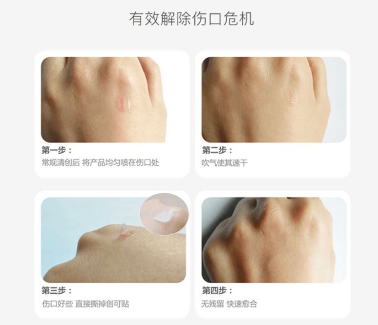 使用方法十分简单,受伤之后进行常规的清创,再往伤口上轻轻一喷,然后均匀的抹开,喷上去的溶液有点清凉,干爽,不油腻,也不会沾衣物。再等个30秒就会在你的伤口上形成一层薄薄的保护膜。