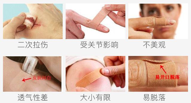 传统的创可贴是长条形的胶带,中间附有纱条。创可贴虽然好用,但是也存在着其弊端:二次拉伤,容易受到关节影响,不美观,透气性差,大小有限,容易脱落。