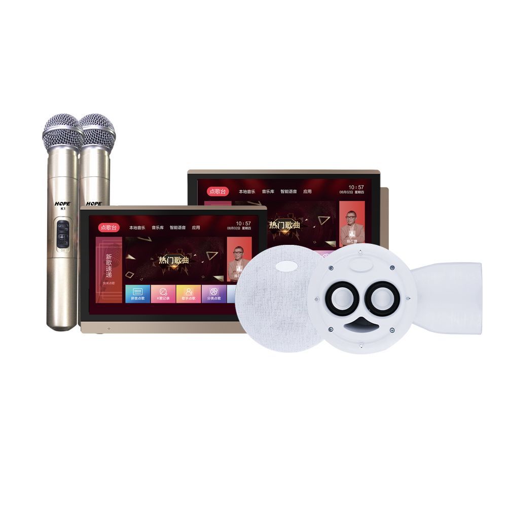 只需要 一个主机+两个话筒+四个吸顶音响,就能将家庭K歌进行到底,一场完美的K歌活动即刻就能展开。