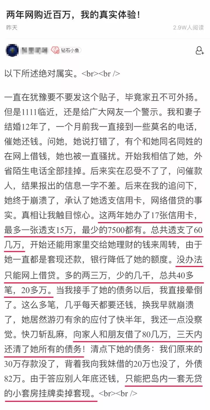 厦门一女子疯狂购物,欠下百万巨债!老公崩溃:不得不卖房...