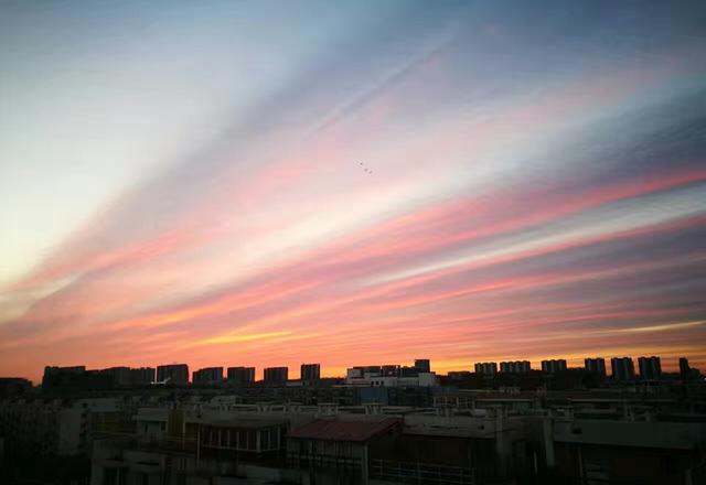 今天早上北京出现的“美哭霞”其实为“密卷云”,它通常出现在高空,具有纤维状结构,存在时间较短。而我们谚语中的“朝霞”,更倾向于早上西方天空中出现的霞。早上,如果西方有鲜艳的红霞,表明西边大气中的水汽和较大的颗粒物较多,天空状态不十分稳定。而我们知道,我们国家的大多天气系统都是自西向东运动的,所以这就说明西方的云雨天气即将到来,这就是“朝霞不出门”的原因。