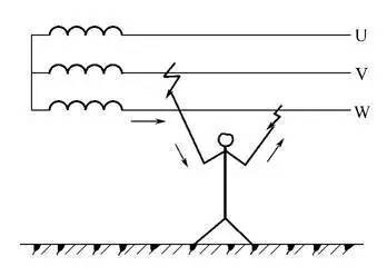 两相触电是指人体同时接触设备或线路中的两相导体而发生的触电现象。若人体触及一相火线、一相零线,人体承受的电压为220V;若人体触及两根火线,则人体承受的电压为线电压380V。两相触电对人体的危害更大。