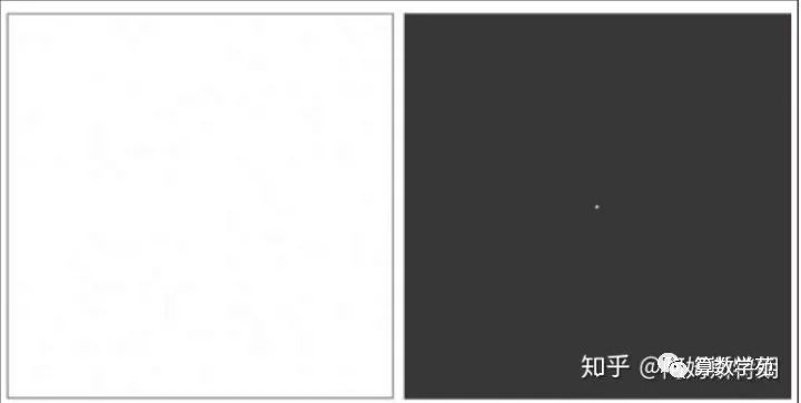 也因此K空间的中心对于低频,周围对于高频。如下图,K空间中只有(0,0)处有值,也就是信号都是直流即不存在变化,所以实空间就是一张白纸。