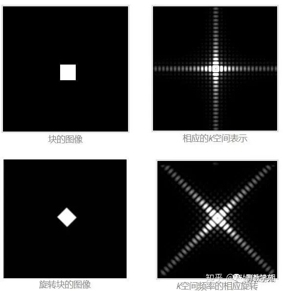 下面这个图像显示了二维傅里叶变换中,实空间旋转多少,频率空间也会相应旋转多少。这其实是高维傅里叶变换缩放定理的一种特殊情况。