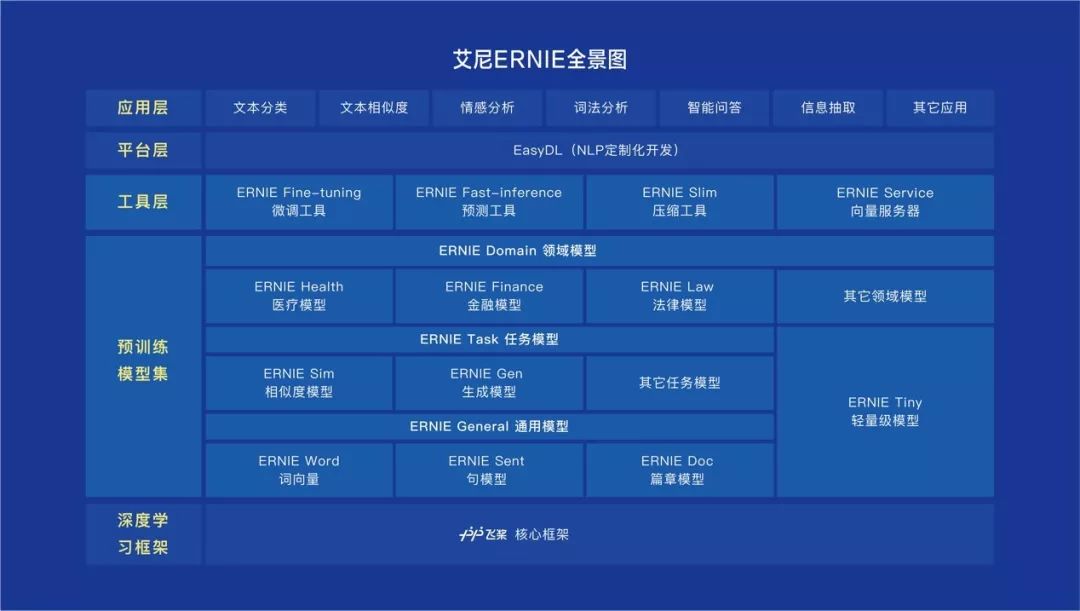 在活动现场,百度 ERNIE 项目组的高级工程师介绍了 ERNIE 的全景框架。目前 ERNIE 开源了中英文的通用模型,后续即将带来一系列的开源工具,包括功能全面的Fine-tuning 工具、速度领先的预测工具、灵活的部署工具和一键式的压缩工具等。此外,ERNIE 行业模型、一键式开发平台也会相继发布。