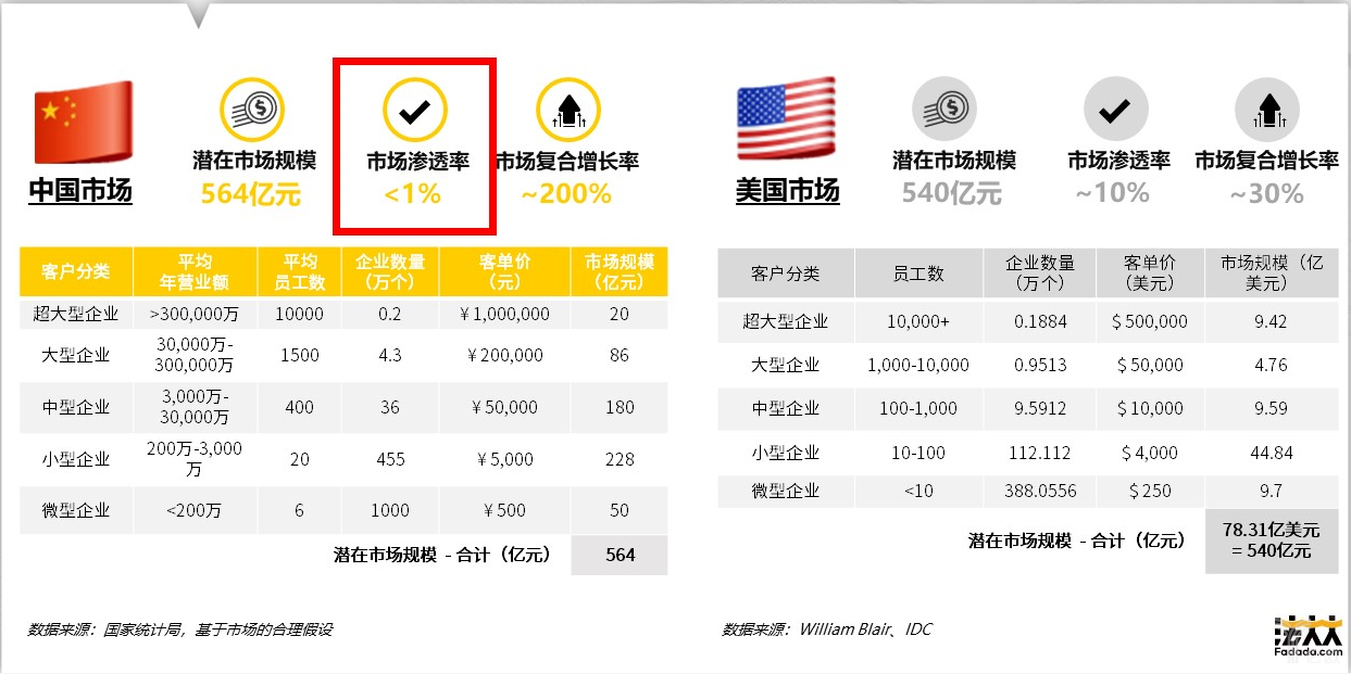 不过做SaaS产品,势必就要在标准化和定制化之间进行选择与平衡。对此,法大大副总裁兼企业服务中心总经理曾晓东表示,“对比美国市场,中国落后十年。相较于硅谷SaaS类产品的高度标准化,以及欧美发达国家对标准化SaaS产品及服务的高接受度,中国SaaS行业服务发展呈现小微企业需求标准化、中大型企业定制化的特征。”