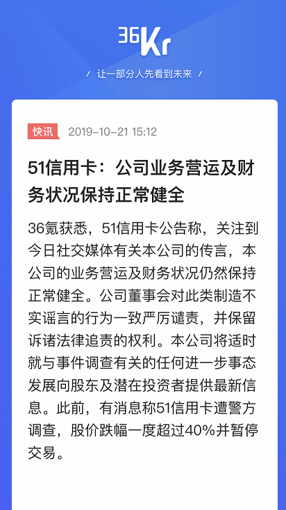 根据新浪科技等媒体报道,51信用卡总部遭到警方突击调查,记者描述为“有一百多名警察冲进51信用卡在西溪的办公大楼”。消息仅传出数小时便已经引发轩然大波,51信用卡管家的股价也应声下跌,目前为止(截至下午14点44分)股价已经跌了34%,而且触发停牌。