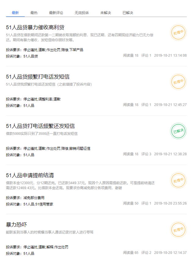 比如,我们在网络投诉平台上随处可见有关51人品贷的投诉,而关键字多数为“暴力催收”。根据投诉者反映,51人品贷在催收过程中存在电话、短信骚扰,暴力威胁恐吓等行为,看来51信用卡管家被查并非偶然事件。