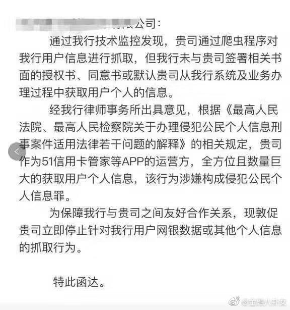 除此之外,网上还有一份声明流出,从内容来看应该是某银卡发现某借贷软件利用爬虫工具非法抓取用户信息。但该声明并未指出和51信用卡管家有关,但在口耳相传之下也为51信用卡管家带来了不少非议。