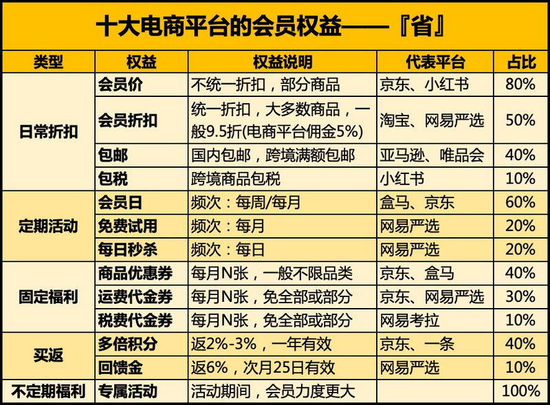 以上是利用「花得省享」模型,从“花”的维度对十大电商平台付费会员政策的解剖。同时,我们将电商平台的付费会员权益分成三大类:得、省和享。