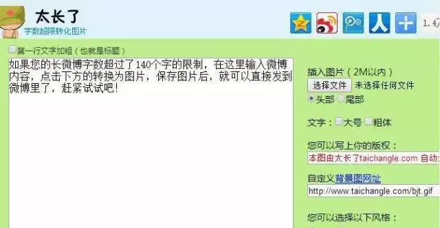 如果你没有购买锤子手机的打算,你还可以使用“太长了”来快速生成精美又漂亮的长微博,你可以选择置入图片、改变字体、插入版权信息、选择背景图片等。