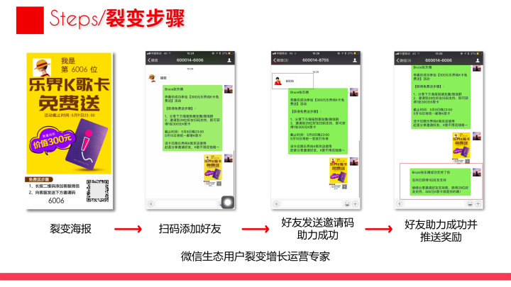 在玩法上和订阅号裂变的逻辑一样,都需要一张裂变海报去传播。只不过,用户识别裂变海报上的二维码是添加客服号,用户之间的助力关系是通过向客服号发送数字码而产生关联关系。这种方法既能够保证用户新增到个人客服号上,又能够实时反馈给用户最新裂变活动进度,效果极佳。