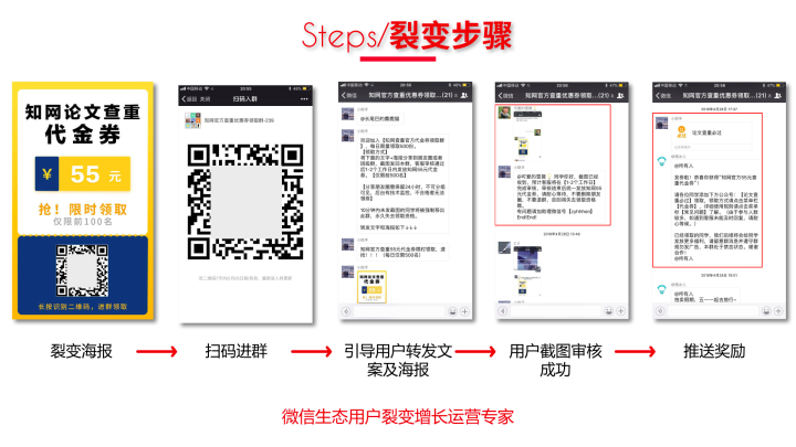 这张图是社群裂变用户完整的关注公众号——进群——分享传播的完整路径。