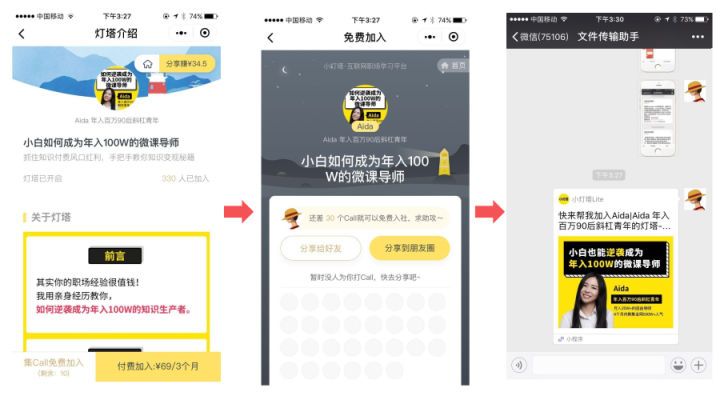 这类小程序的裂变增长和公众号任务裂变思路是一致的,通过课程或奖品作为吸引点,引导用户分享号召用户助力,达成固定人数助力,即可免费领取课程/获得奖品。其中以知识付费类产品小灯塔做得尤为出众:
