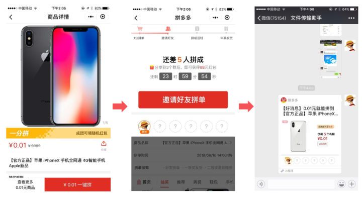 其裂变模式就是拼团,拼多多上的一件商品通过“拼团“的方式“引诱”用户主动为了得到低价产品去转发分享,用户在微信环境中发起分享后可分享给微信群、微信好友,邀请大家一起完成拼团。而且用户在完成分享成功之后,支付环节也能在小程序一键完成,十分方便。