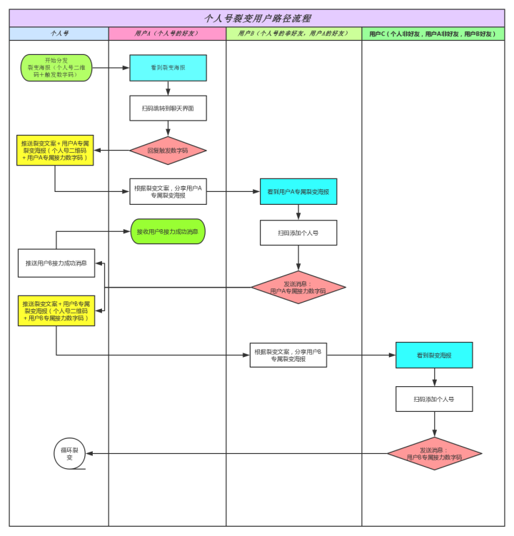 以一级用户A为例,裂变海报推送给A用户,A用户扫码参与会收到公众号消息规则&活动海报图,A用户为了拿到活动奖品需要邀请新用户参与助力,A用户邀请好友B用户,B用户为A用户扫码接关注公众号,完成助力活动任务,A用户通过公众号收到B用户的助力消息,同时B用户进入裂变流程,公众号会推送属于B用户的个人邀请海报,B用户为了领取奖品会再去分享邀请他的好友C用户,C用户为B用户扫码接关注公众号,完成助力活动任务。以此,活动循环往复,达到裂变传播效果。