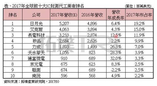 如果说中国的半导体事业哪方面比较强,那一定是封装和测试了。虽然说不是全球最强大的,但是相比fabless和foundry,封测工厂已经很好了。我们先看一下2017年全球封测厂的排名情况。