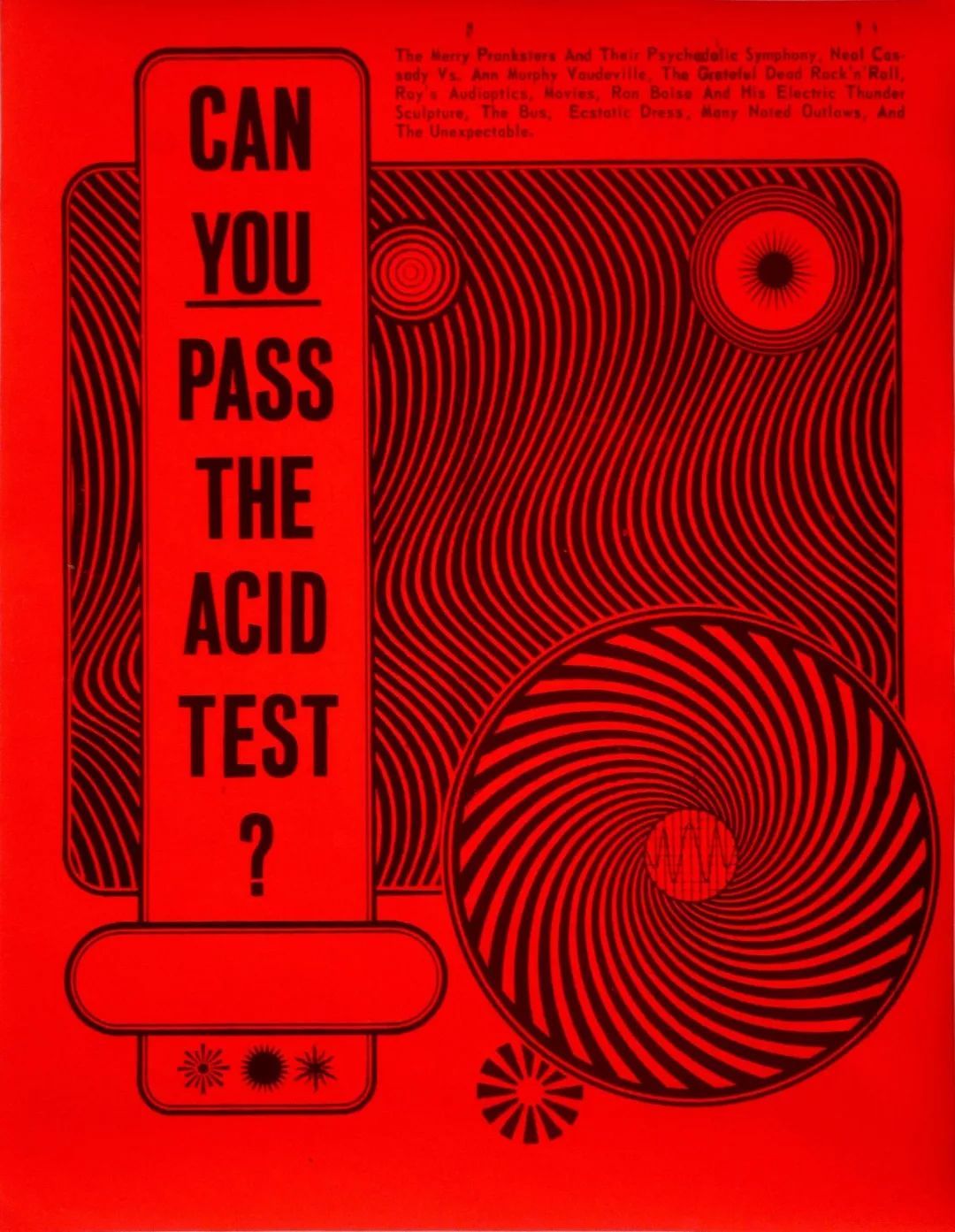 正拉着他那群艺术家、作家组成的“欢乐捣蛋鬼” Merry Pranksters,驾着那辆“Further”校车,穿越美国开办迷幻派对,大肆宣传分发免费的迷幻剂 LSD。“CAN YOU PASS THE ACID TEST?” 你能通过酸性测试吗?垮掉的一代正逐步往嬉皮士方向转化。