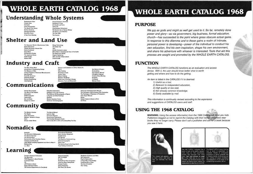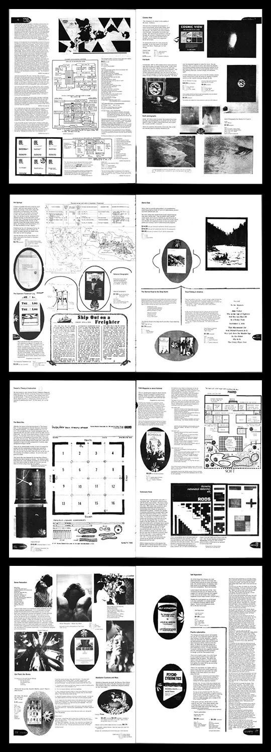 “access to tools”(获取工具的途径)是《全球概览》的副标题,所以它的终点并不是推荐字面意义的工具,而是催化体验获取某种能力的过程。而《全球概览》本身也是工具, “一个低维护成本、高产出、自我维持的批判性信息服务”——一个能提醒公社社员最新的社会技术发展、并能将他们彼此联系起来的系统。