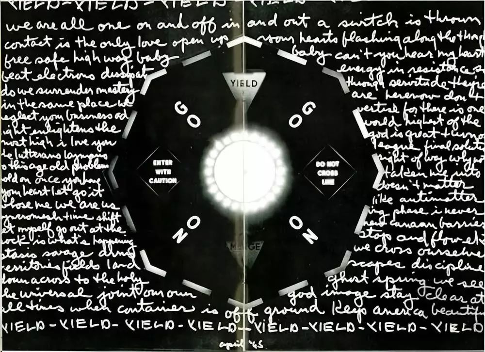 ▲ USCO的标志性作品,上图为“NO OW NOW”,创始人Gerd Stern的三首诗,第一次出现是在USCO的海报上;下图为USCO的迷幻艺术作品,印度神像灯光绘画。USCO是20世纪60年代由诗人Gerd Stern, 电子技师Michael Callahan和前波普艺术画家Steve Durkee在纽约创立的媒体艺术团体,在1964-1966年间最为活跃,被认为是拓展电影、视觉音乐、装置艺术、互联网、新媒体艺术发展的关键。