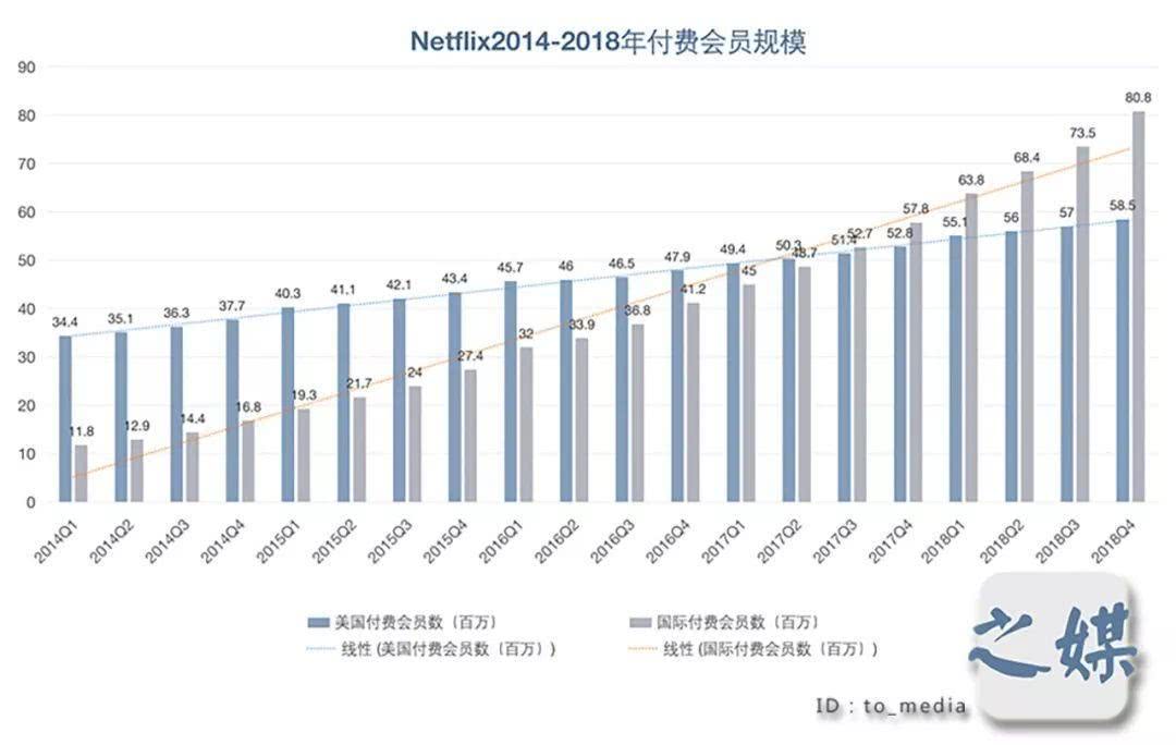 在付费用户规模上,作为流媒体行业付费会员模式的首创者,截至第四季度末,Netflix的全球订户总数达到了1.39亿人。不过,由于美国国内用户规模已接近至天花板,付费会员的增量大多来自海外市场的贡献。