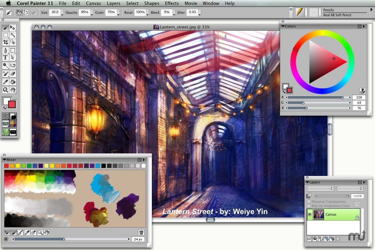 painter:数码素描与绘画工具的终极选择,是一款极其优秀的仿自然绘画软件,拥有全面和逼真的仿自然画笔。它是专门为渴望追求自由创意及需要数码工具来仿真传统绘画的数码艺术家、插画画家及摄影师而开发的。它能通过数码手段复制自然媒质(Natural Media)效果,是同级产品中的佼佼者,获得业界的一致推崇。