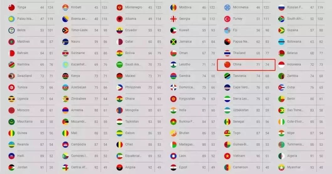 中国排名71,有74个免签或落地签目的地,自2017年初以来上升了14位。