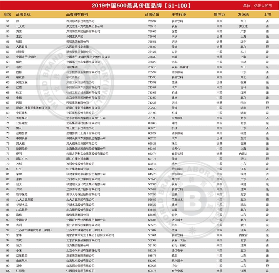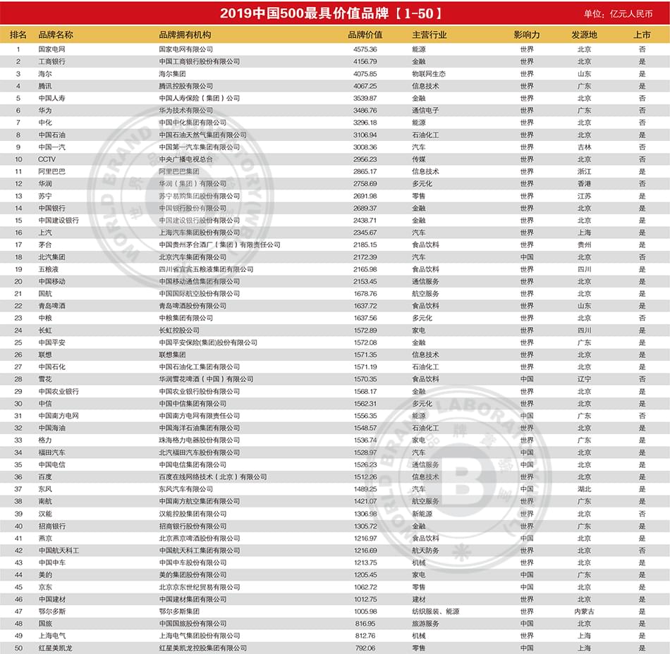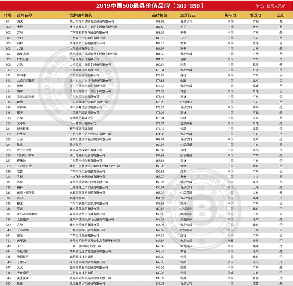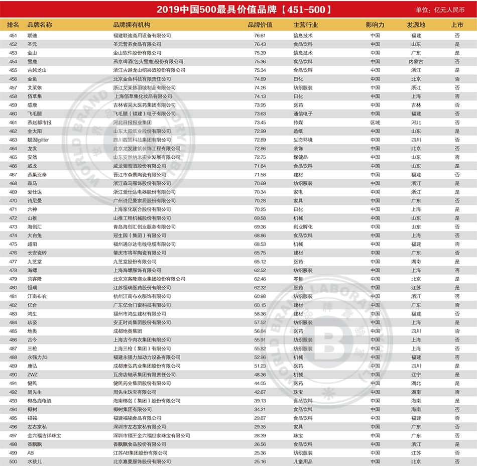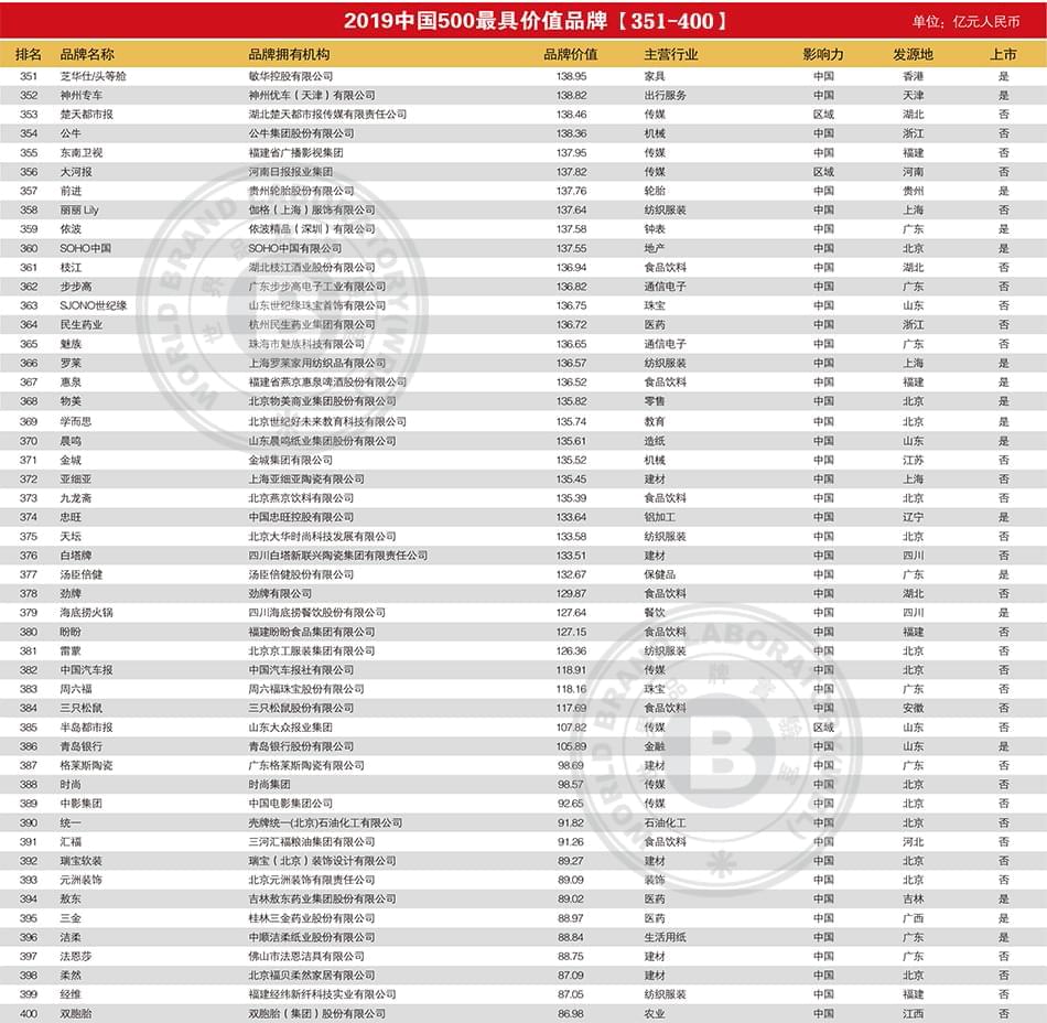2019年中国500最具价值品牌排行榜