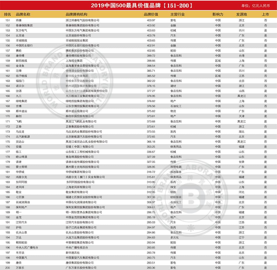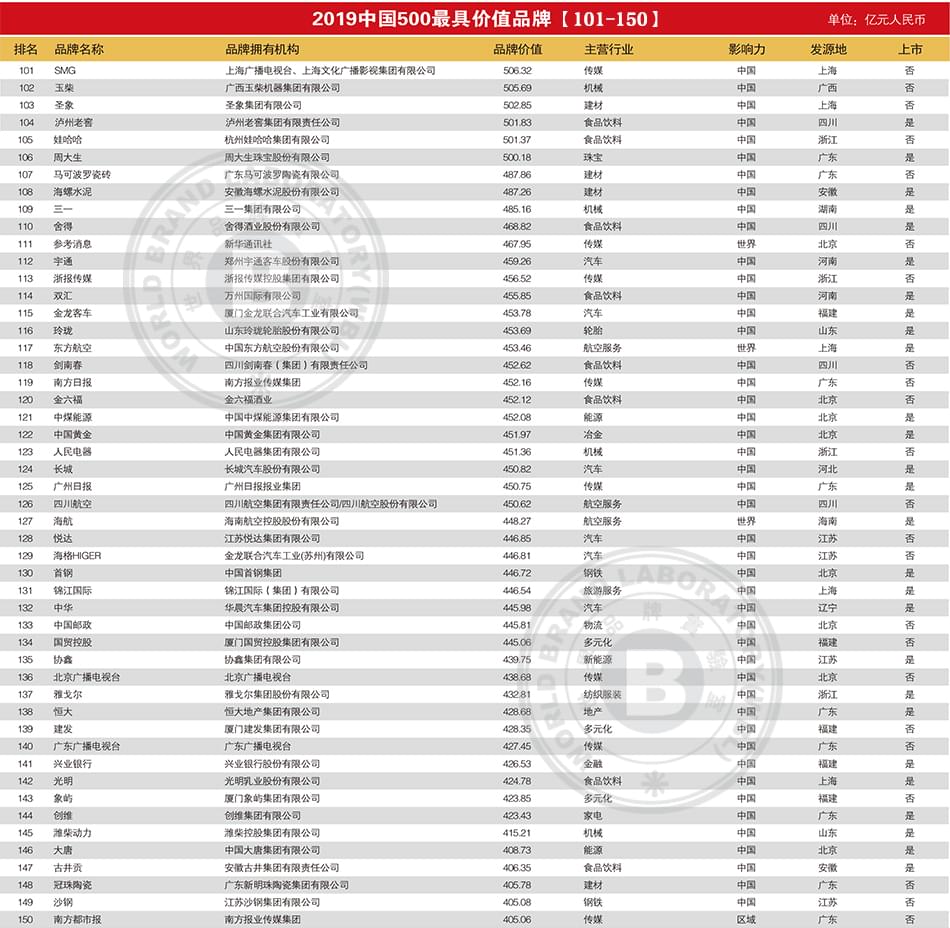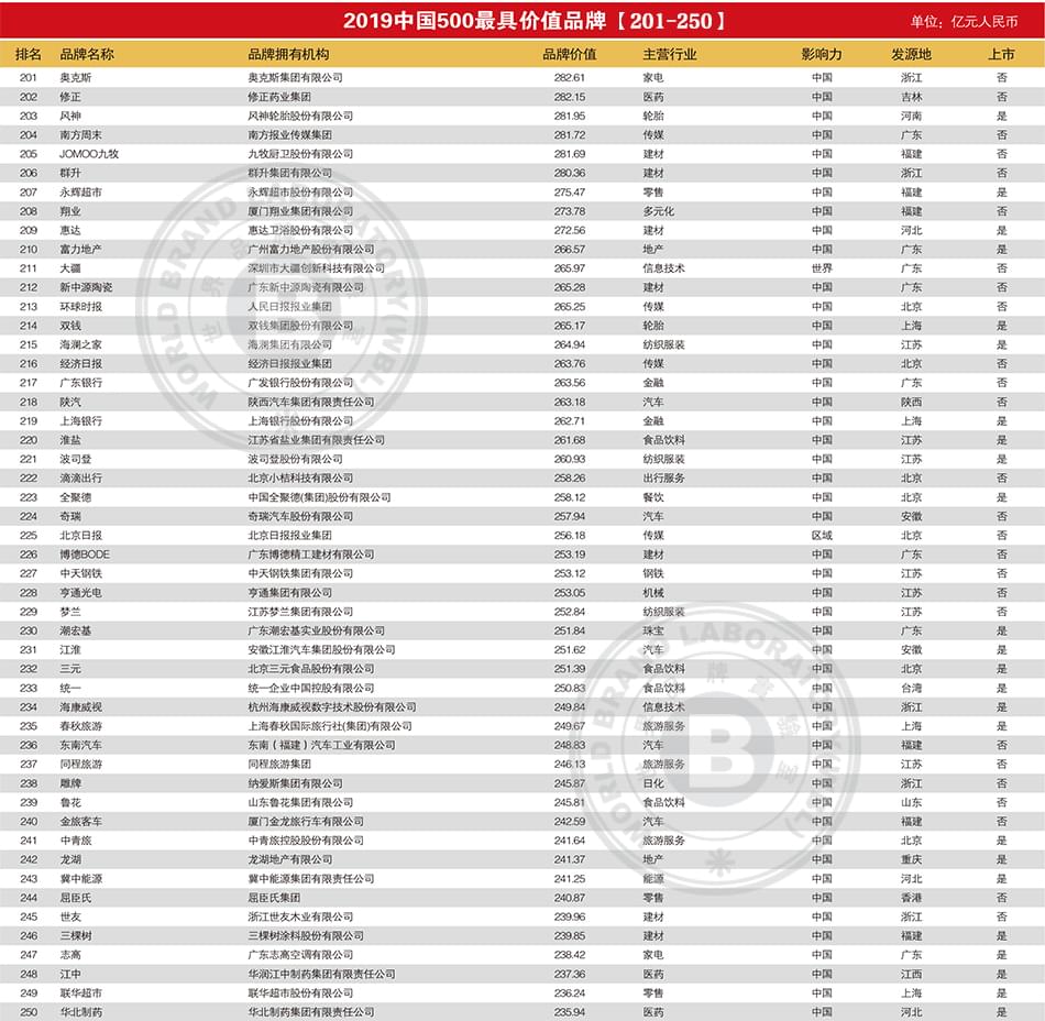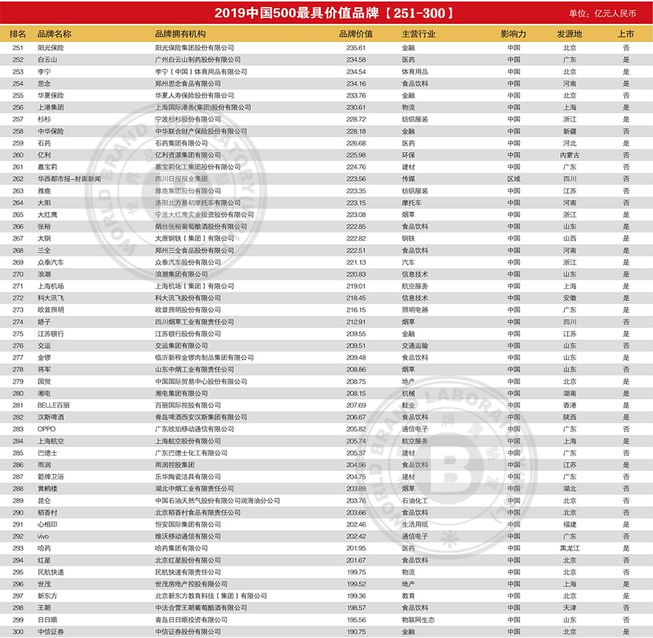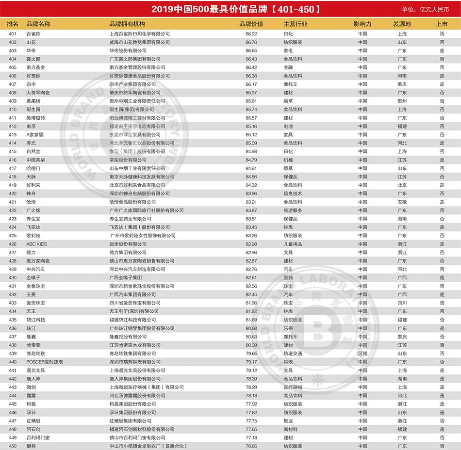 2019年中国500最具价值品牌排行榜