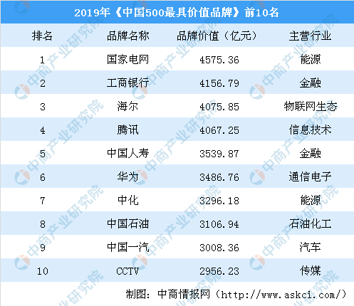 中商情报网讯:近日,世界品牌实验室发布了2019年《中国500最具价值品牌》分析报告。报告显示,2019年度《中国500最具价值品牌》的总价值为218710.33亿元,比去年增加34251.22亿元,增加幅度为18.57%。国家电网、工商银行、海尔、腾讯、中国人寿、华为、中化、中国石油、中国一汽、CCTV位居中国500最具价值品牌前10。