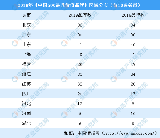 从上榜品牌区域分布来看,北京有96个品牌入选,名列第一,主要原因是赢利能力强的央企总部集中在北京。广东和山东分别有90个和41个品牌入选,位居第二和第三。上海有40个品牌上榜位居第四,福建、浙江、江苏上榜品牌数量超30个。与上年相比,上海上榜品牌减少1个,福建减少13个,同时北京上榜品牌增加2个,山东、浙江各增加1个,江苏、河北各增加4个,四川增加3个。