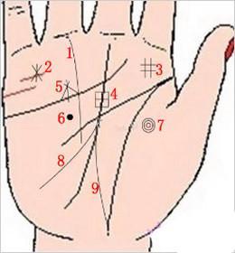 四、田字纹:在事业线、生命线附近出现田字纹、口字纹等之类,田字纹说明命主比较适宜从事诸如房产、土地、土产、矿业等行业,而口字纹则说明比较适宜从事培训、咨询、律师等行业。