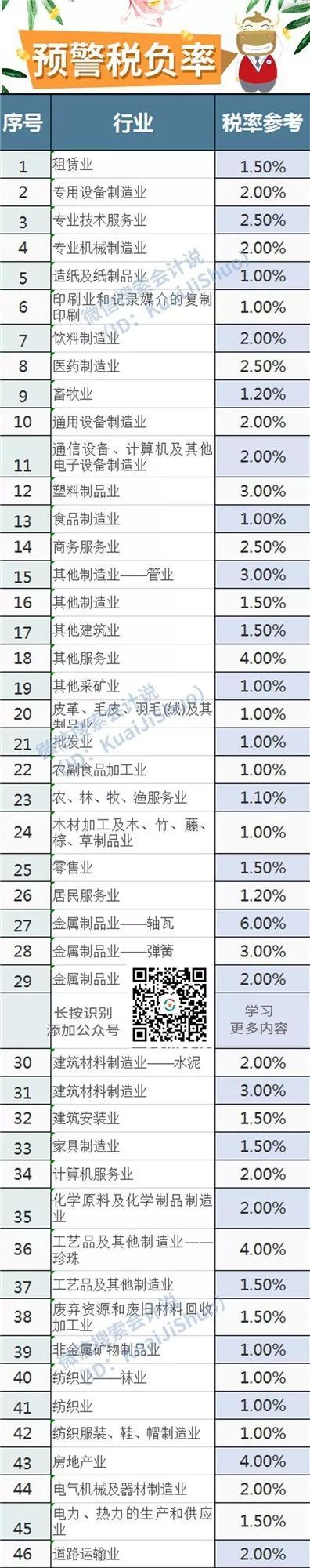 不同行业,不同地区,税局会根据当地、同行业来定一个税负,即应该交多少税(用百分比计算)。如果企业低于这个税负,系统就会发出预警,这时税局就会让你自查,甚至稽查。我们可以掌握在不低于行业平均税负率1%左右(商业企业1.5%左右)。今天给大家整理了最新各行业“预警税负率”。