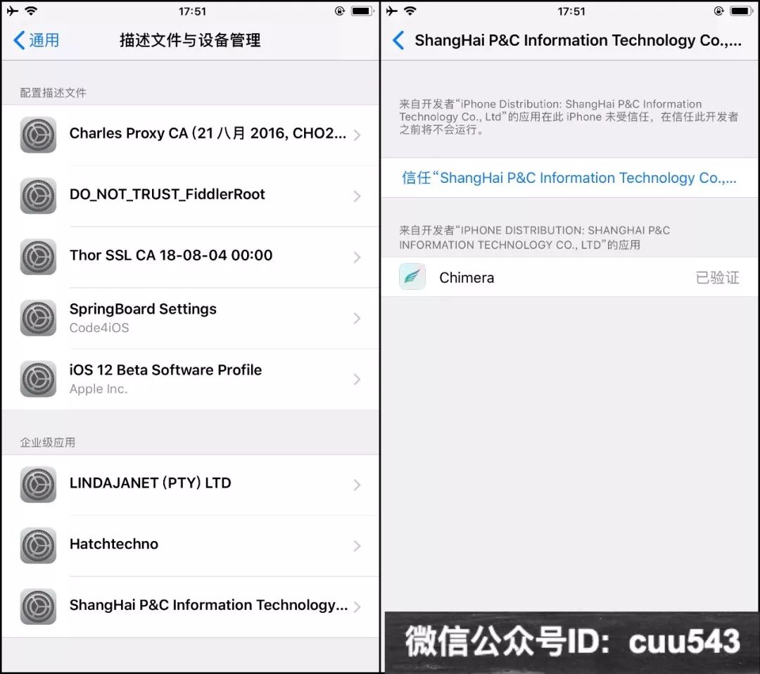接着进入到设置 → 通用→ 描述文件与设备管理 →,找到相应的企业证书并信任,如下图
